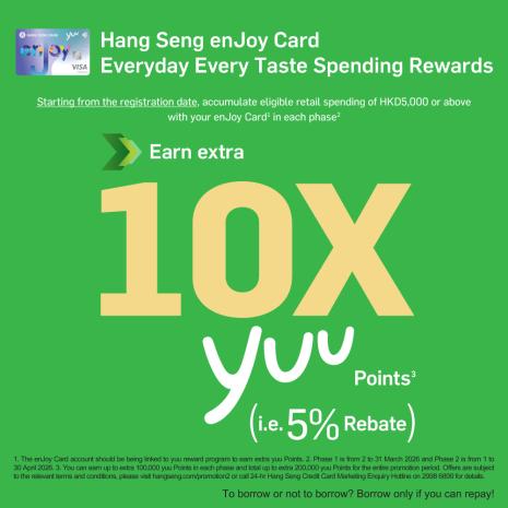 Accumulate eligible retail spending of HKD4,000 or above are entitled to extra 10x yuu Points with your Hang Seng enJoy Card, starting from the date your register.
