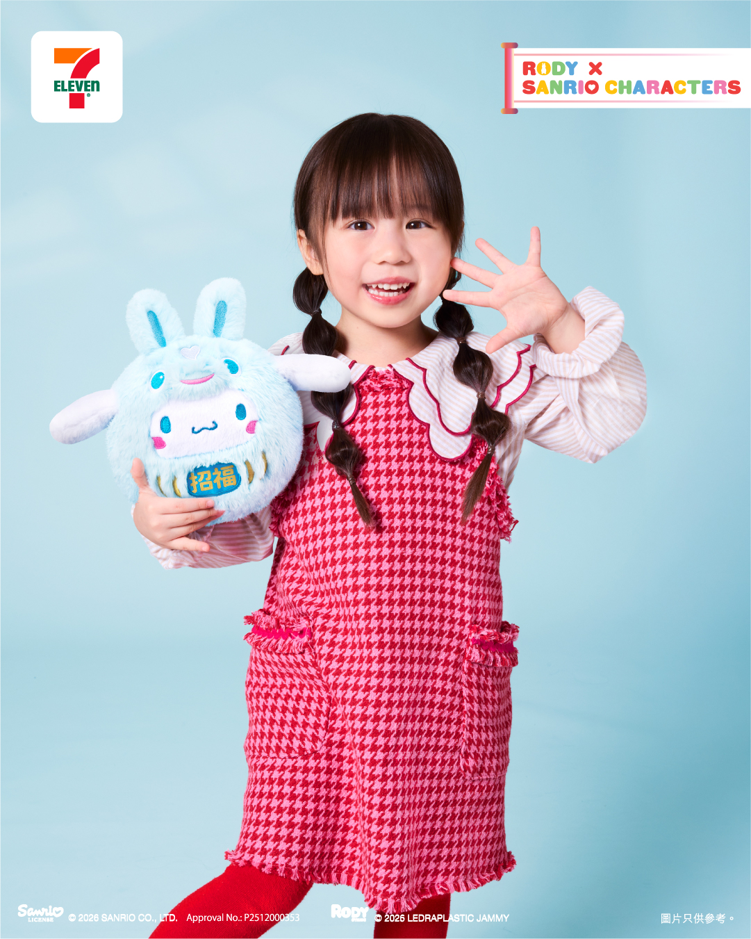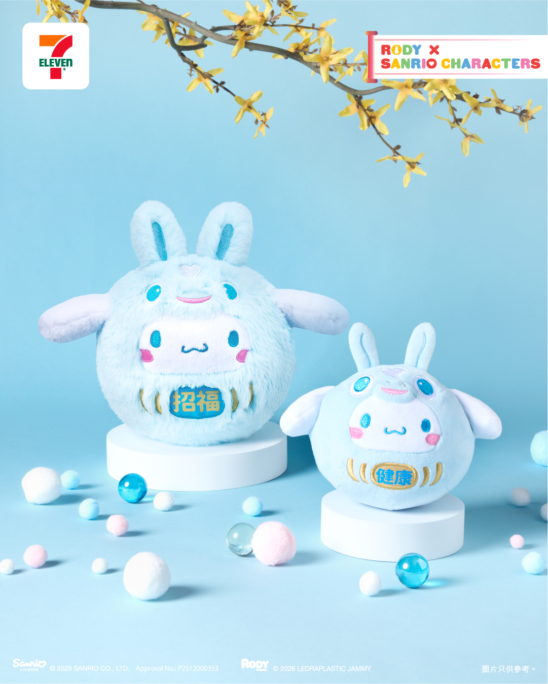 7-Eleven 應用程式限定版 — 「15cm郁郁耳Cinnamoroll 」 亦首次登場,由Cinnamoroll戴上藍色的Rody 跳跳馬頭套可愛現身。公仔毛茸茸的觸感舒服柔軟,按壓其腹部可郁動Cinnamoroll的耳朵,象徵招福。增添互動趣味之餘,亦為你的新年增添生氣!