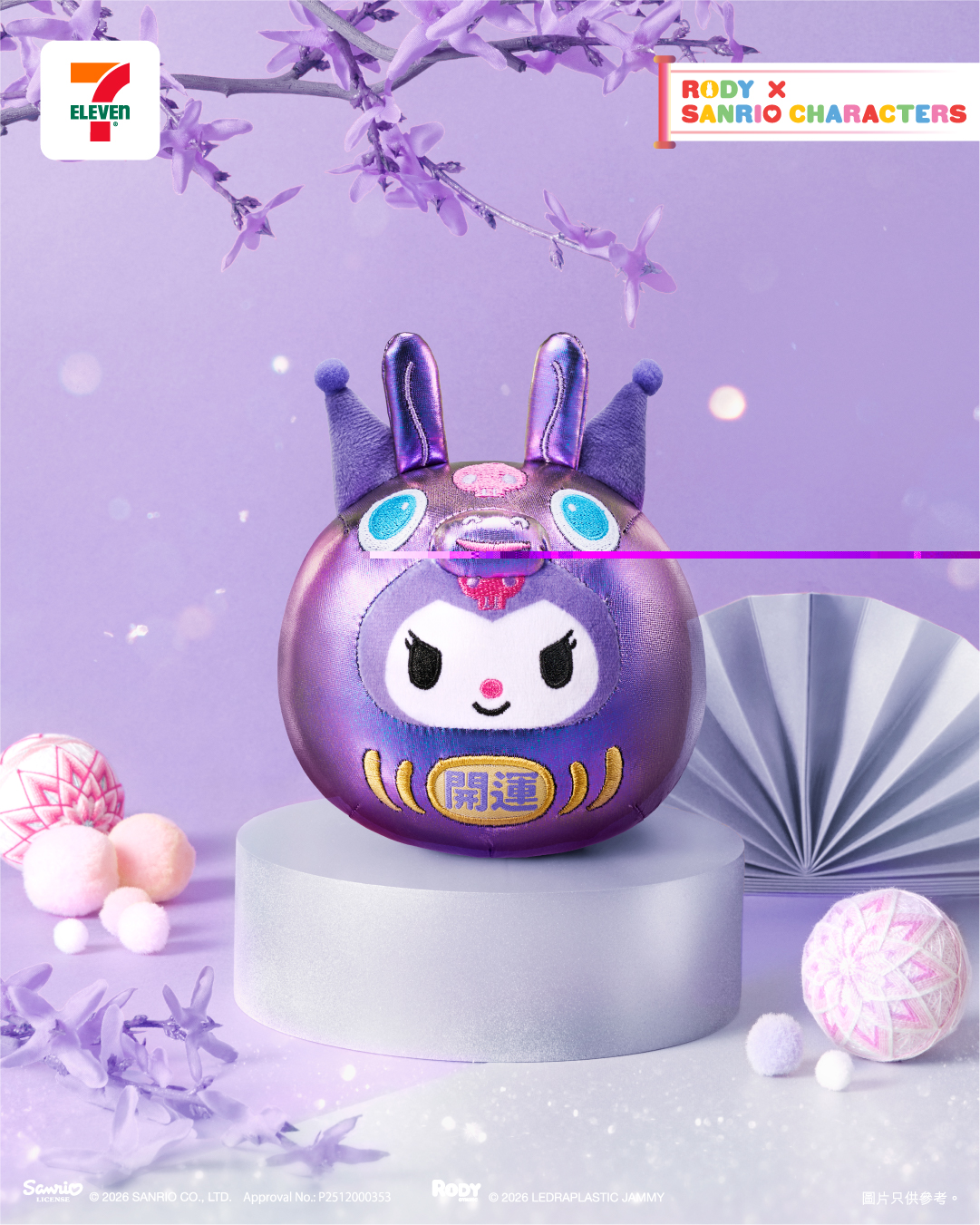 同步推出1:19隱藏版 — 「Kuromi 閃爍開運不倒翁公仔」,Kuromi換上閃閃設計的紫色Rody 跳跳馬頭套亮相,經典的紫色配上閃爍效果,盡顯Kuromi的獨特魅力,極具收藏價值,是粉絲必儲的珍藏款式!