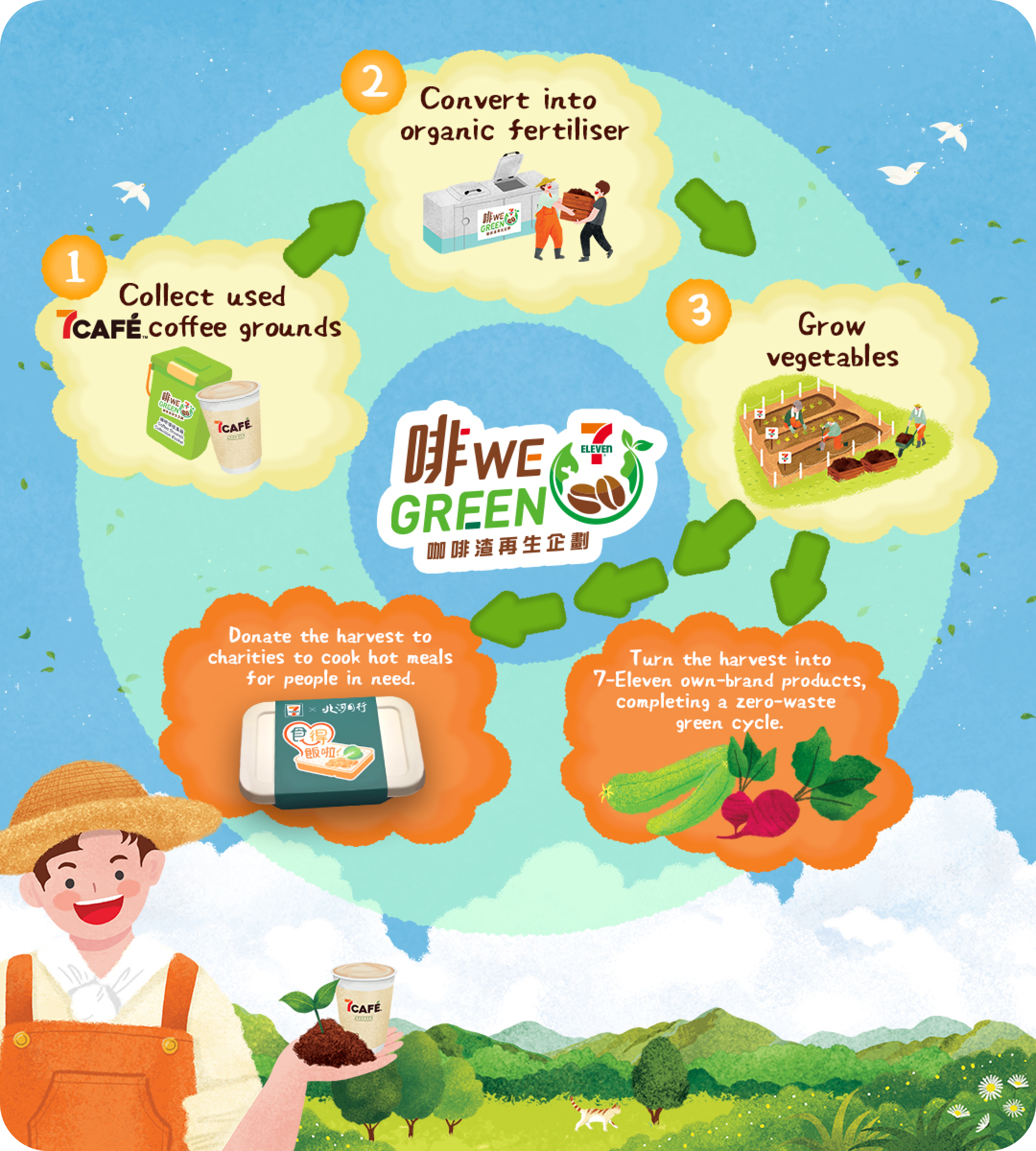 In 2024, 7-Eleven launched Hong Kong’s first sustainable green cycle of care initiative – the Grounds to Green Coffee Grounds Upcycling Program. As the city’s largest coffee network, 7CAFÉ offers convenient, great-value freshly ground coffee while supporting food-waste recycling and caring for the planet. Grounds to Green turns that commitment into a sustainable green cycle of care – “giving coffee grounds a second life and caring for the Earth together”. We’ll continue to expand this roadmap so we can all live more planet-friendly, every day.