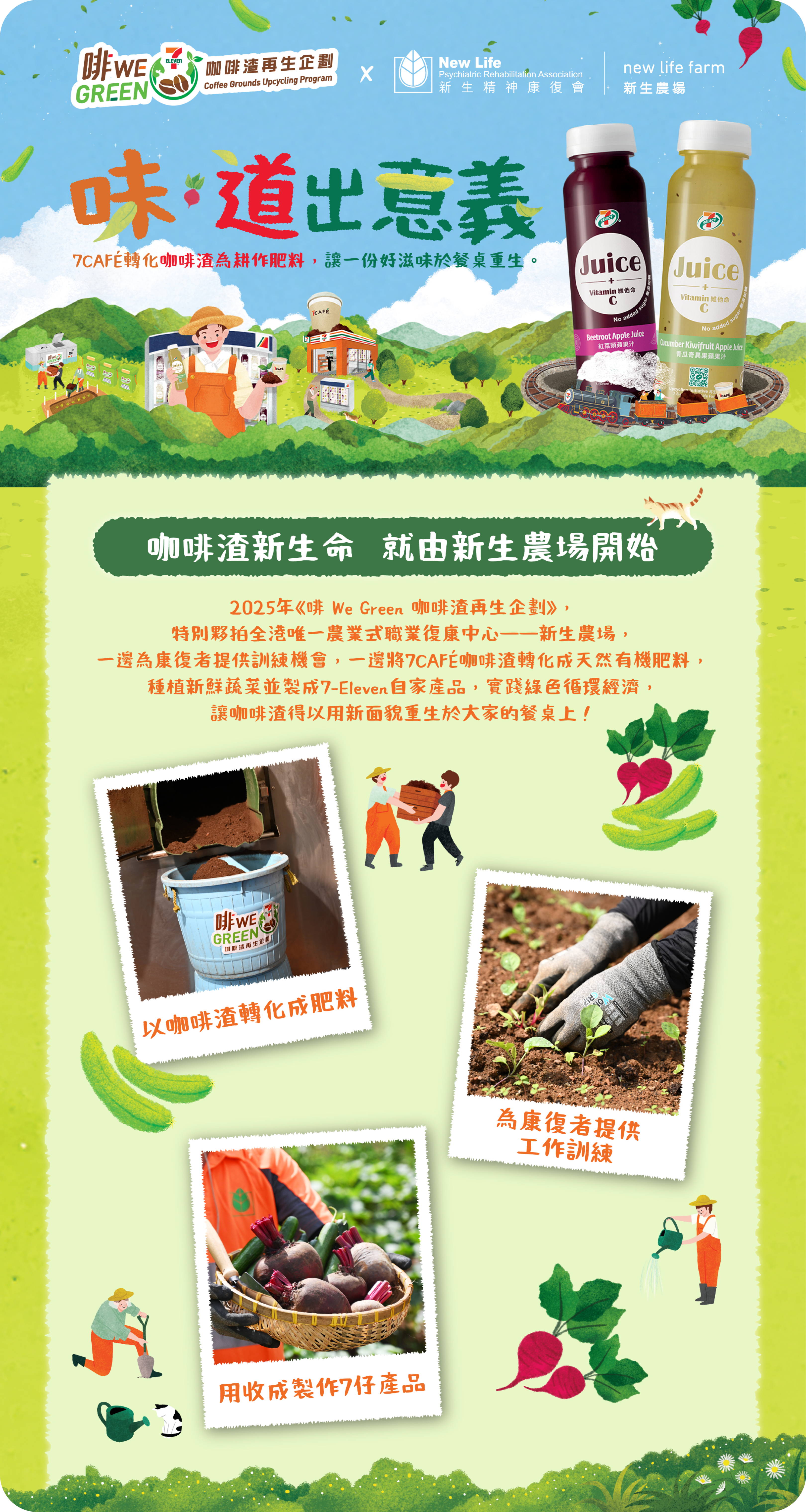 夥拍「WeGen farming」及「新生農場」 給予咖啡渣第二生命 Image Image 一齊睇吓 了解更多綠色循環經濟 咖啡渣可以點樣轉化成天然肥料,再成為大家享用到嘅7-Eleven滋味?現在一同走入新生農場直擊一下!