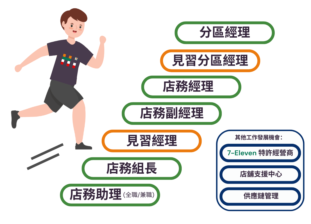7-Eleven 著重團隊成員發揮潛能,成就其個人成長。我們的晉升階梯清晰透明,對工作積極熱誠和投入的員工提供多元化的發展機會。除了前線工作,員工亦可轉戰幕後,投身店舖支援中心崗位,如市場營銷、採購和物流等,員工可按個人喜好和發展步伐規劃長遠職涯。