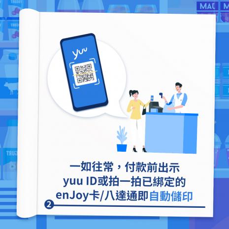 【儲印有賞攻略 1】 yuu App 中顯示「 yuu印花」圖示的獎賞,代表可儲印花 【儲印有賞攻略 2】 於付款前出示yuu ID或拍一拍已綁定的enJoy卡/八達通即自動儲印 【儲印有賞攻略 3】 點選「加到"已儲存"」,於「已儲存」頁面追縱儲印花進度 【儲印有賞攻略 4】 儲夠印花,點選「查看獎賞」或在「已儲存」頁面獲得獎賞兌換二維碼 【儲印有賞攻略 5】 出示「獎賞兌換二維碼」以兌換獎賞