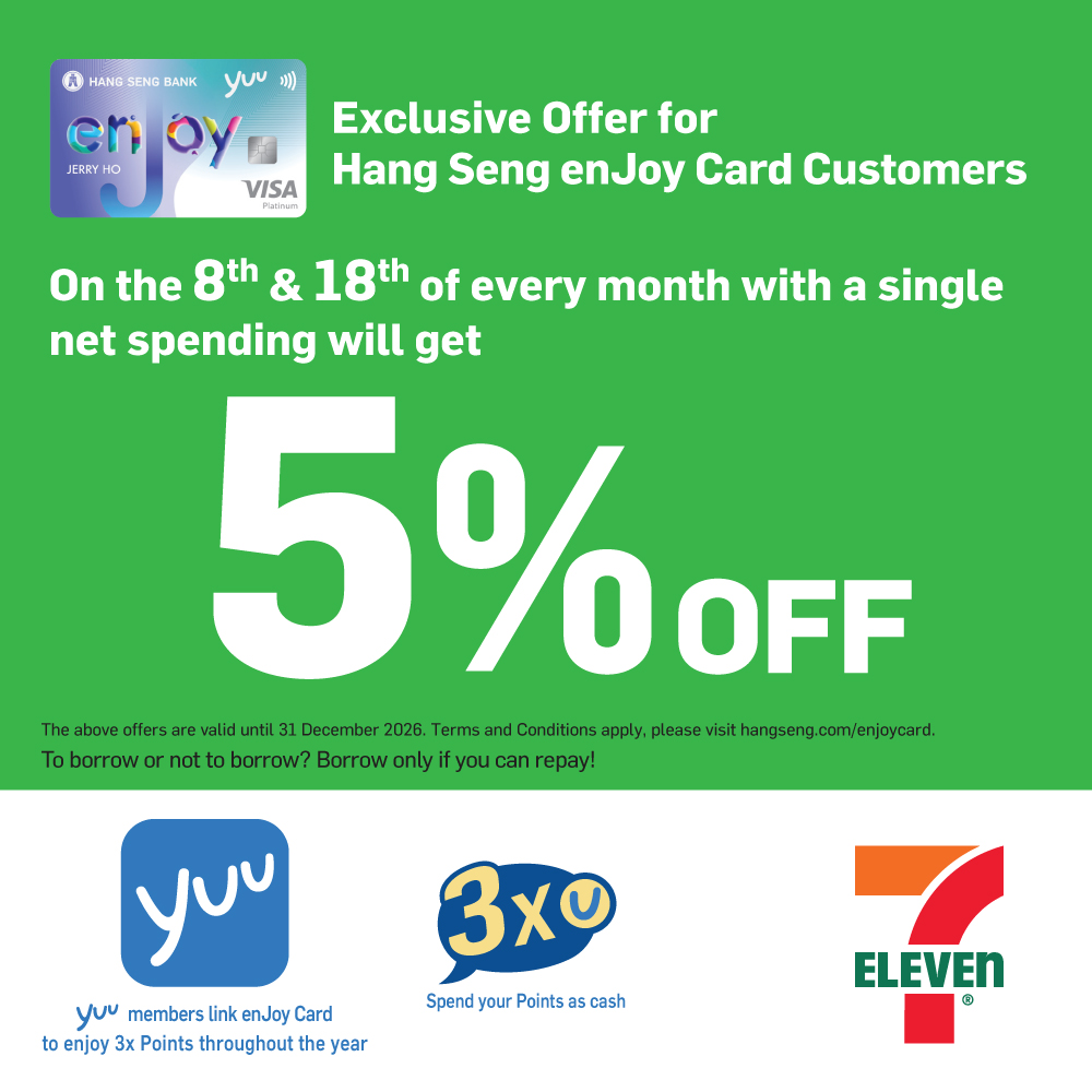 Enjoy 5% off* on the 8th and 18th of every month at 7-Eleven in Hong Kong with Hang Seng enJoy Card.