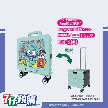 推廣期內*購買任何Hangyodon產品滿$1,000於付款前輸入優惠碼「HG200」並於7-Eleven 應用程式完成下單,即可享$200折扣優惠。優惠受條款及細則約束,詳情請參閱7-Eleven 應用程式。
