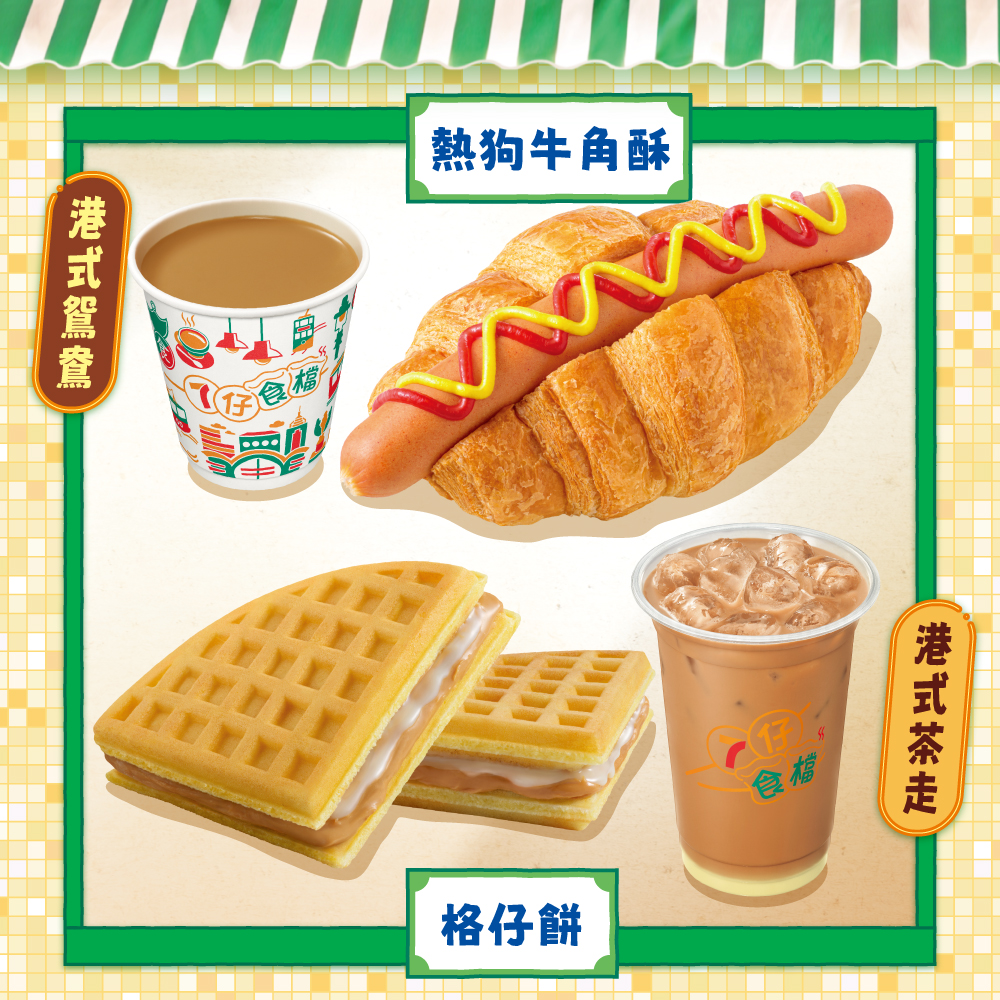 全新熱狗牛角酥, 格仔餅, 鴛鴦及茶走 「7仔食檔」今期為您帶來新產品 – 熱狗牛角酥, 格仔餅, 鴛鴦及茶走。想品嘗可到各指定7-Eleven店舖。 部份貨品只限於指定店舖提供。貨品數量有限,售/換/送完即止。所有價格以個別店舖為準。貨品圖片只供參考。就一切有關事宜,7-Eleven將保留最終之決定權。