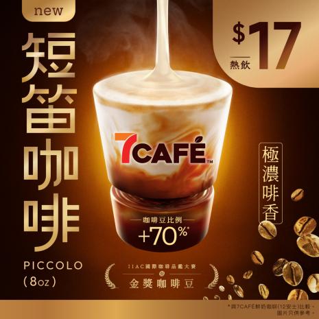7CAFÉ推出全新短笛咖啡 (Piccolo)*,沿用榮獲IIAC國際咖啡品鑑大賽金獎的獨家拼配咖啡豆,經過特定調配的8安士份量,咖啡豆使用比例比鮮奶咖啡高70%^, 咖啡油脂能鎖住咖啡香氣,更能品嚐出咖啡本身杏仁及草本香味;加入適當份量之熱奶泡成為絕配比例,增加順滑口感及層次,適合忙碌上班族或希望快速提神的你!